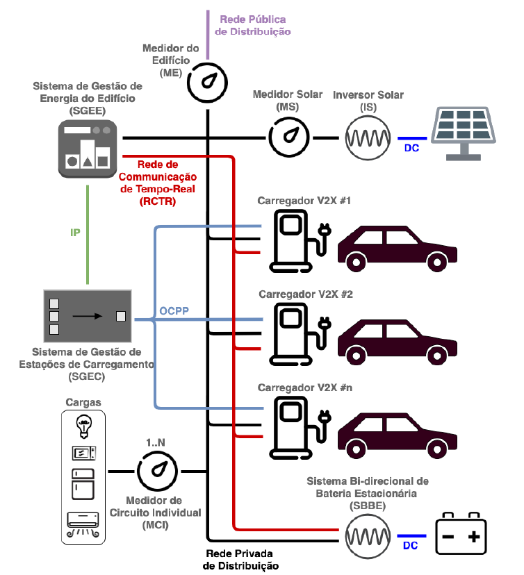 - rivate electric power distribution: local network of the building that interconnects V2X chargers, local inverters (solar, stationary battery, or others), meters and loads.